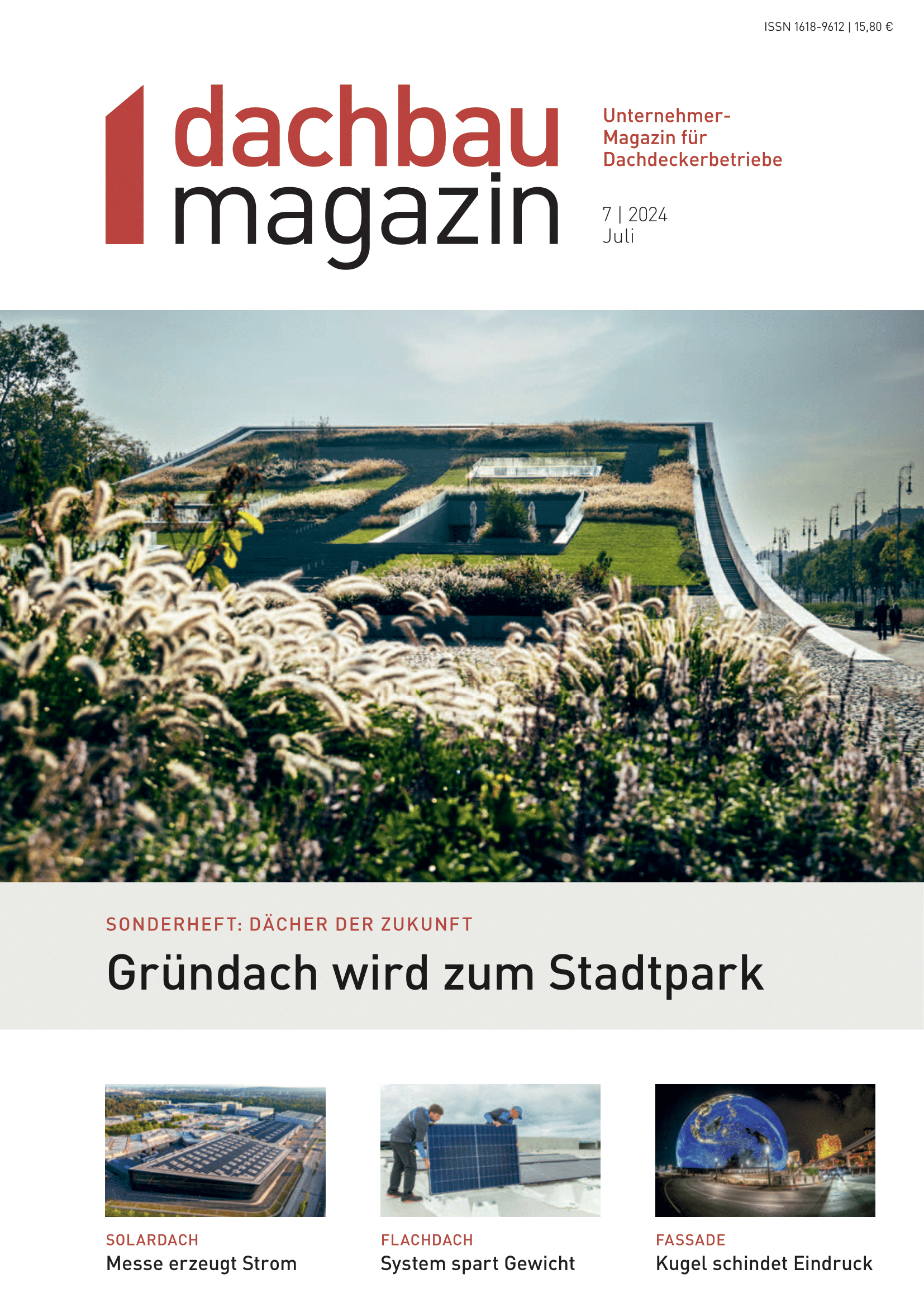 Das dachbaumagazin ist die montatliche Fachzeitschrift für den erfolgreichen Unternehmer im Dachdeckerhandwerk. dachbaumagazin informiert praxisorientiert, konstruktiv und unabhängig über Bautechnik, Markt und Betriebsführung. Das Magazin für die Entscheider in Dachdeckerbetrieben.