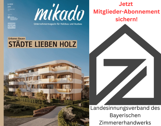 Exklusiv für Mitglieder des Landesinnungsverband des Bayerischen Zimmererhandwerks: Sichern Sie sich das Fachmagazin mikado, offizielles Organ des Bundes Deutscher Zimmermeister (BDZ), im ersten Jahr zum halben Preis.